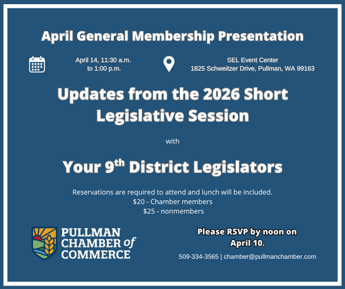 Join us for our General Membership Presentation and Luncheon. Our GMP will be from 11:30 a.m. to 1 p.m. on Tuesday, April 14 in Pullman. Our special presentation will be a Legislative Wrap-Up presented by our local State Representatives Joe Schmick, Mary Dye, and Senator Mark Schoesler. This will be a fascinating presentation on this year's activity in Olympia.